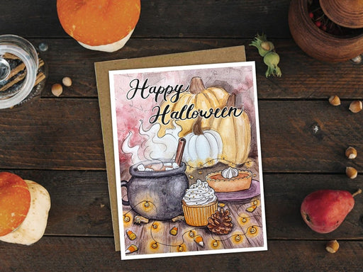 Motif's Art Studio$5.50| /Send spooky greetings with this Happy Halloween card! Decorated with a warm cup of cinnamon cocoa and dash marshmallows, mini pumpkin pie, and a Ha...