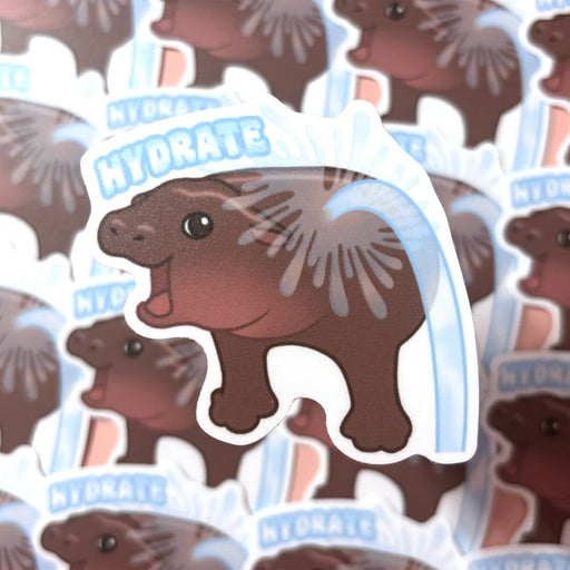 Parasol Paper Co$3.00| /[WATERPROOF] Hydrate Pygmy Hippo Meme Vinyl Sticker Decal. Approximate size: 2.5" x 2.5". Matte finish with UV protective laminate