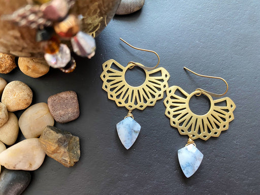 BeadsNShine$50.00| /This earring consists of geometric brass findings paired with gemstone moonstone . The total length of the earrings is around 2.75-3 inches from th...