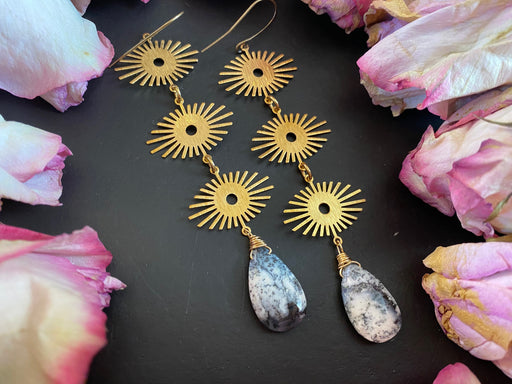 Dendritic opal earrings ,Statement earrings, natural stone earrings, brass earrings, gifts for her
