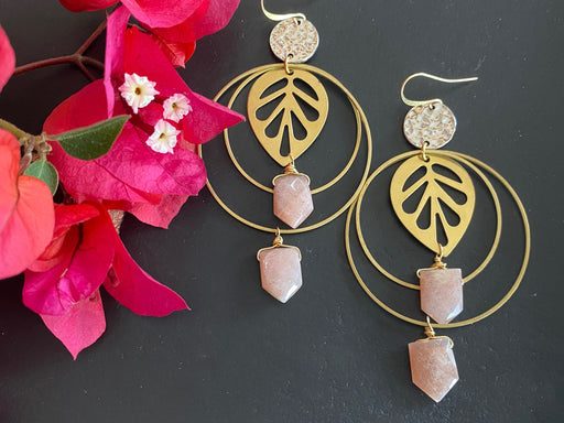 Double Peach moonstone earrings, geometric earrings , Modern brass earrings, mixed metal earrings, statement earrings