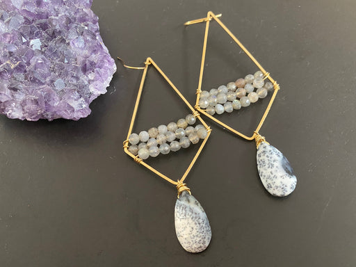 Dendritic opal earrings ,Statement earrings, natural stone earrings, brass earrings, gifts for her, labradorite beads wrapped