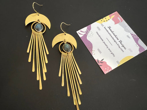 BeadsNShine$30.00| /This earring consists of geometric brass findings paired with lapis lazuli and chocolate moonstone stones. The total length of the earrings is arou...