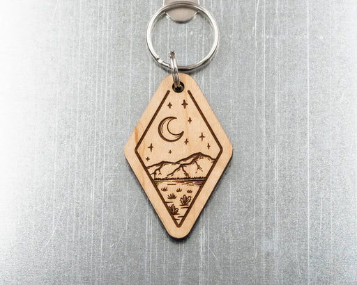 Steamer Lane Design$7.00| /This wood keychain features the moon rising over desert mountains and cactus. It measures approximately 2.2" tall and has .5" and 1" split rings. ...