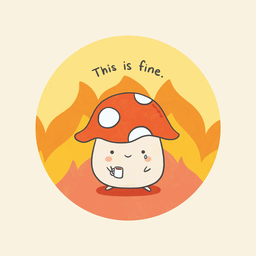 Meridrop$3.00| /This sticker features a forlorn mushroom surrounded by flames, with a single tear dripping down its cheek. The text reads "This is fine." ✦ Weather...