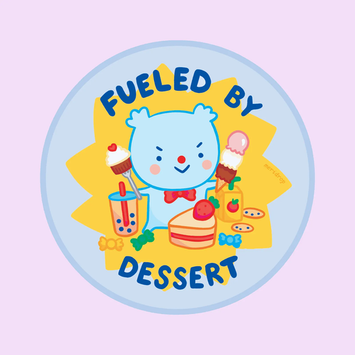 Meridrop$3.00| /This sticker features a koala surrounded by dessert, including strawberry shortcake, boba, ice cream, and candies. The text reads "Fueled by desser...