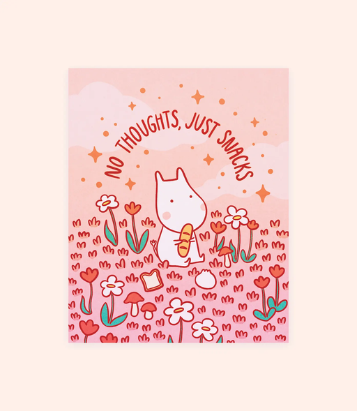 Meridrop$15.00| /This print features a troll creature hugging a baguette, surrounded by flowers and other breads. The text reads "No thoughts, just snacks." ✦ Profe...