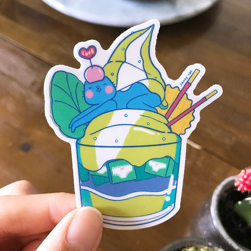 Panty Cat$4.00| /• Matcha soft served with mochi and Panty Cat • 3" Vinyl sticker • Weather-resistant, dishwasher friendly - F012