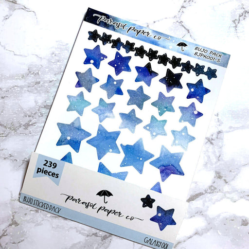 Parasol Paper Co$15.00| /Galaxy (Blue) - Bujo Planner Sticker Pack. This bundle includes 6 sticker sheets with a total of 239 stickers in the curated colorway. Each sheet f...