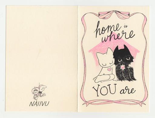 naiivu$5.00| /An off-white card with a riso printed illustration of two creatures leaning on each other with the words "Home is Where You Are".