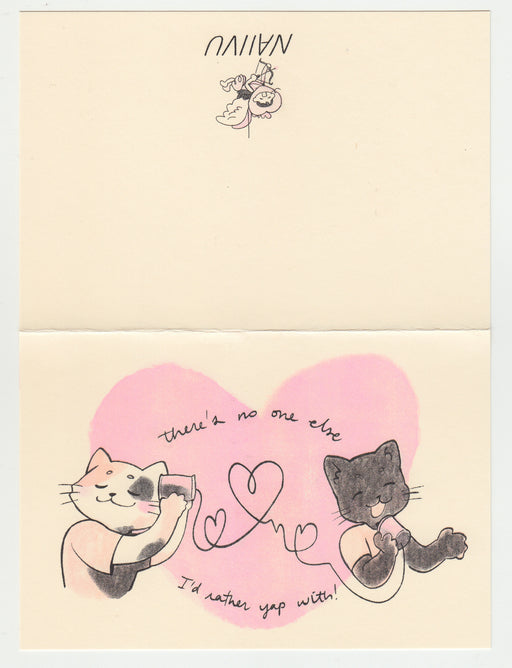 naiivu$5.00| /An off-white card with a riso printed illustration of two cats talking with each other through a telephone can with the words "There's no one else ...