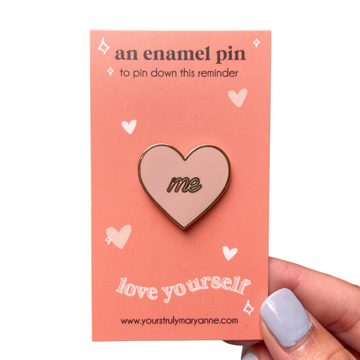 Yours Truly, Mary Anne$12.00| /Pin down the reminder to love yourself with this heart "me" enamel pin. 1" x 1" Comes with metal backing
