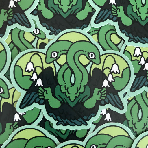Ultra Infinite Shop$2.50| /A two-headed serpent angel holding lilies of the valley, for Aromantic pride. This sticker is approximately 3 inches (7.6 cm) on the longest side...
