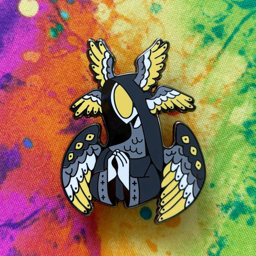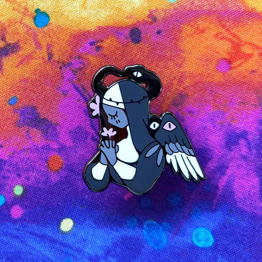 Ultra Infinite Shop$16.00| /Dandelion Angel is 2 inches wide with gold plating and screenprint. It has hard enamel and two pin posts with rubber backings.