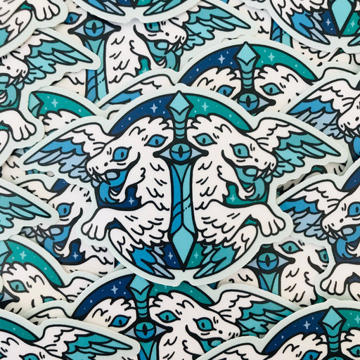 Ultra Infinite Shop$2.50| /A two-headed gorgonops angel in blue and green, for Gay pride. This sticker is approximately 3 inches (7.6 cm) on the longest side, and printed on...