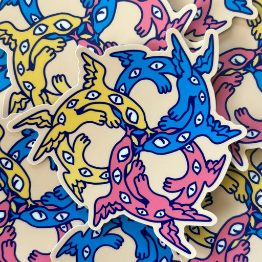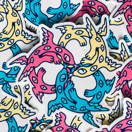 Ultra Infinite Shop$2.50| /A trio of angelic serpents, for Pansexual pride. This sticker is approximately 3 inches (7.6 cm) on the longest side, and printed on matte vinyl.