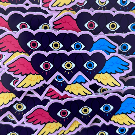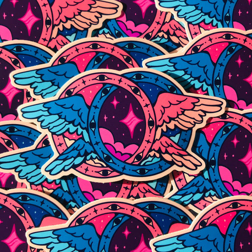 Ultra Infinite Shop$2.50| /Entwined winged eyewheels, for Omnisexual pride. This sticker is approximately 3 inches (7.6 cm) on the longest side, and printed on matte vinyl.