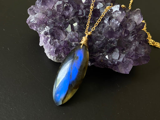 Labradorite pendant, natural gemstone, 14k gold fill chain, intense blue flash
