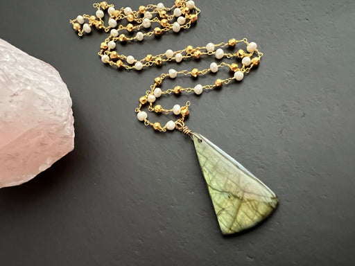 labradorite pendant / natural gemstone / Pearl rosary chain/ womens necklace