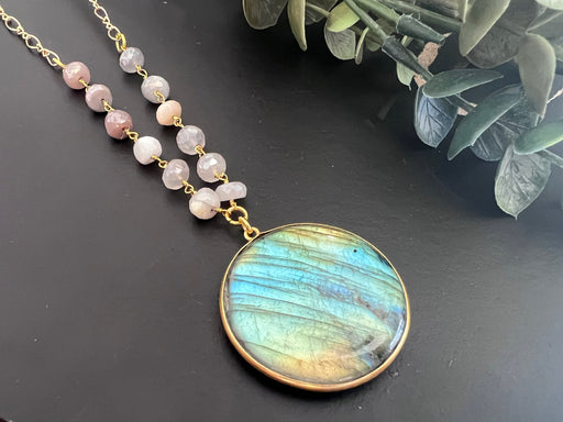 Labradorite necklace , statement necklace, anti tarnish gold chain and peach moonstone beads , length 28 inch
