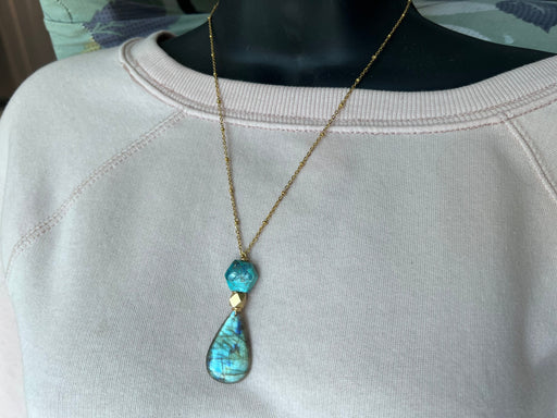 BeadsNShine$42.00| /The stone is labradorite. The stone has a eye catching cut. The labradorite is paired with a hexagonal Chrysocolla and the chain is beautiful 18k g...