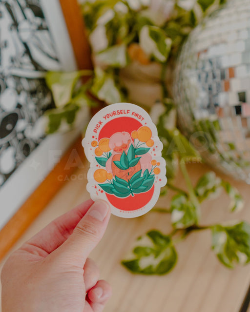Faith Cao$5.00| /ONE DIE CUT STICKER ILLUSTRATING A PERSON WITH PINK HAIR HOLDING A LEAF IN A COLORFUL BACKGROUND WITH THE PHRASE “PICK YOURSELF FIRST” CAN BE USED...