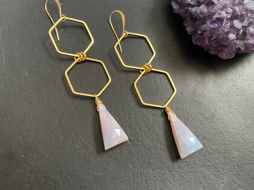 Pink opal earrings ,natural stone jewelry, geometric brass earrings , statement earrings , gold dangles