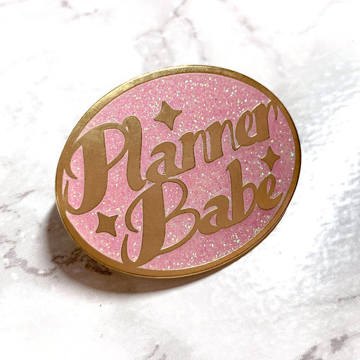 Parasol Paper Co$10.00| /Pink Planner Babe Enamel Pin. Each pin is 1.125" x 1.5" and features pink glitter enamel on gold metal. - LL052