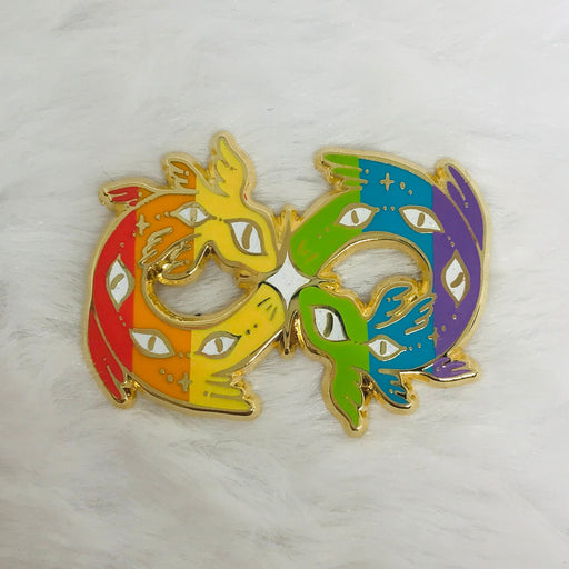 Ultra Infinite Shop$16.00| /Holy serpents in rainbow, for autism pride. This pin is approximately 1.5 in (4 cm) wide. The pin has hard enamel, gold plating, and two pin posts...