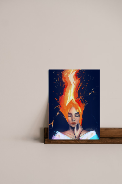 Notebean Stationery$8.00| /Mini vertical print with girl with fire hair shooting up with a dark blue background