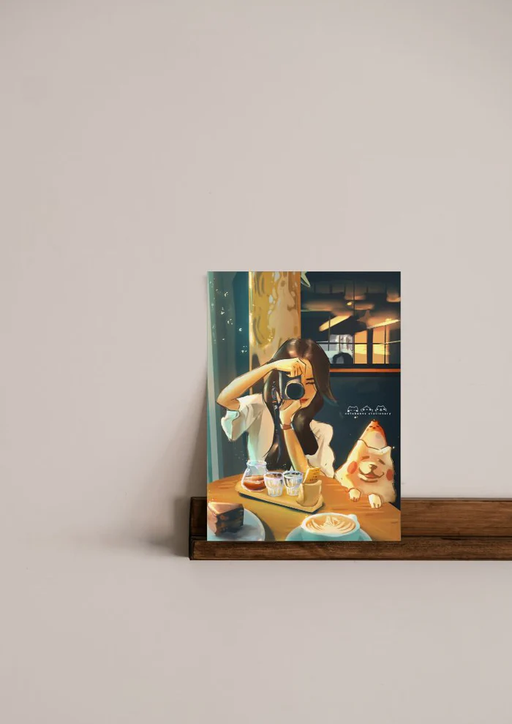 Notebean Stationery$8.00| /Mini vertical print with girl in cafe taking a photo of a cafe setting