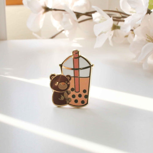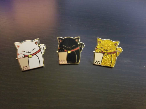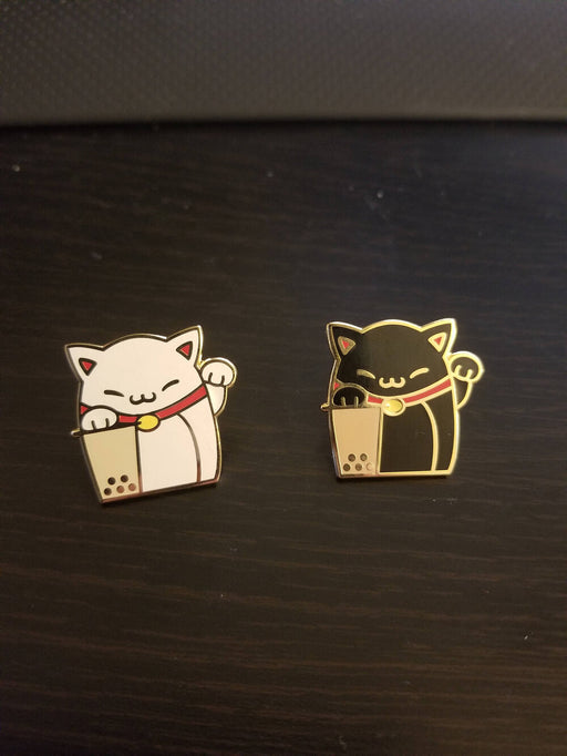 Maneki Boba Hard Enamel Pin - Neko Cat Milk tea (White, Black, and Gold)