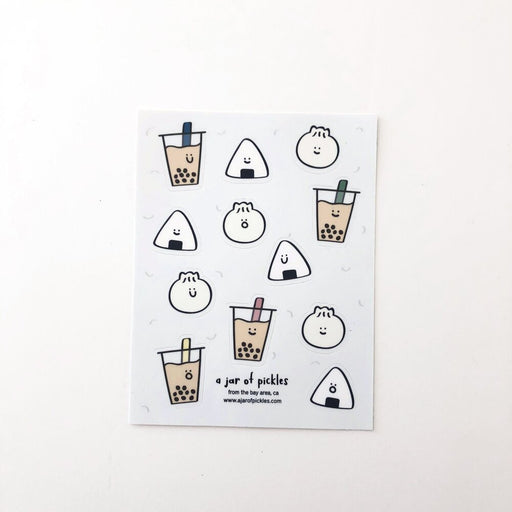 A Jar of Pickles$6.00| /Boba, Dumpling bao, Onigiri Vinyl, waterproof stickers 12 stickers on a sheet Sheet measures 4.25x5.5" Stickers range from .75" tall to 1.5" tall -...