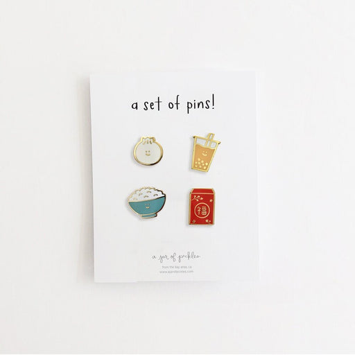 A Jar of Pickles$29.50| /A collection of 4 Chinese /Taiwan-themed pins— these each mean something so personal to me; I'd eat these truly any day. Boba, dumpling, red envelo...