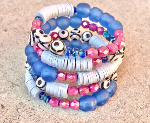 African bracelet/ glass and bone beads bracelet/ African vinyl bracelet/stack bracelet/ size 7"/ set of 3/ hot pink color / royal blue