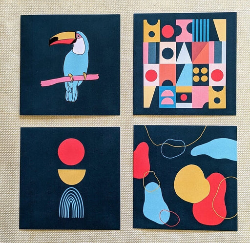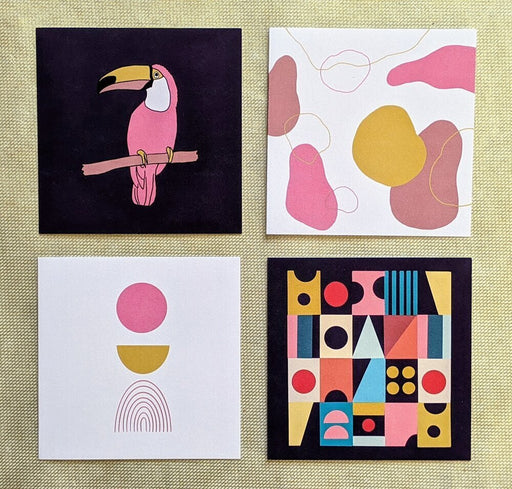 Brown Budapest$11.00| /🦜This listing includes a set of 4 Modern Folded Cards. It features geometric shapes, boho forms, a toucan and some fun patches. It has a cheerful a...