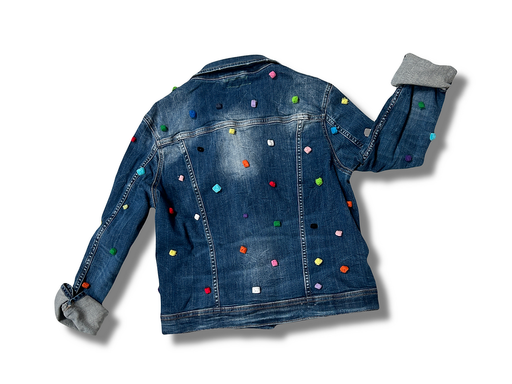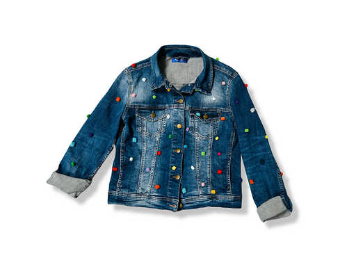 Jumbo Jibbles$150.00| /Deni jacket in XL with rainbow pompoms. Each pompom is handmade. They cover the front, back and sleeves for an all-around sprinkl...