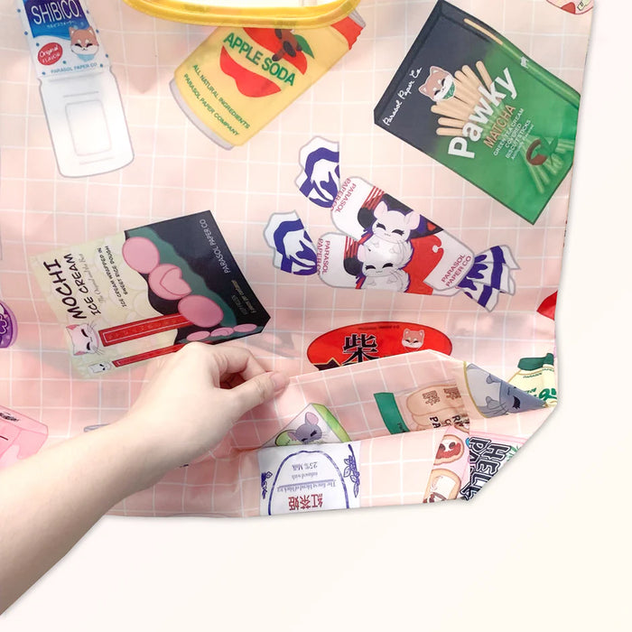 This is a new version of our previous totes. This one is larger, with longer handles and a gusset for a flat bottom allowing for greater ease when placing objects inside the reusable tote. This version is studier and does not have a pouch to fold in to.