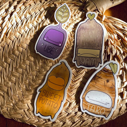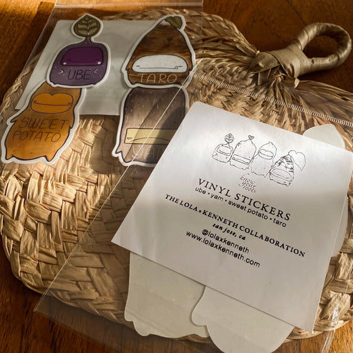 Lola x Kenneth$10.00| /The lineup: Ube, Yam, Sweet Potato, and Taro.They're best spuds! One pack of four (4) durable vinyl stickers. One (1) each of: Ube, Yam, Sweet Pota...