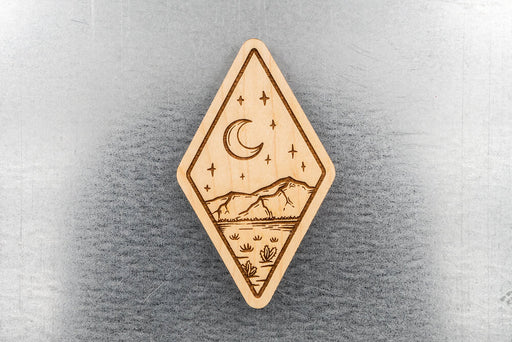 Steamer Lane Design$7.00| /This wood magnet features the moon rising over desert mountains and cactus. It measures approximately 3.3" by 2" with a 1.1" strong ceramic magnet...