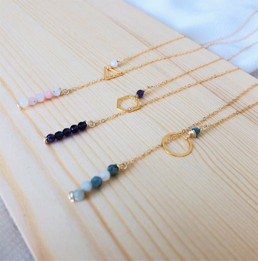 Bohemian Moon Art$38.00| /Gold filled 14k Lariat Necklace. Geometric Shapes: Circle - Aquamarine Hexagon - Amethyst Triangle - Pink Opal Let me know which one would y...