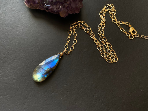Labradorite drop necklace, rainbow , blue green flash pendant, anti tarnish gold necklace,
