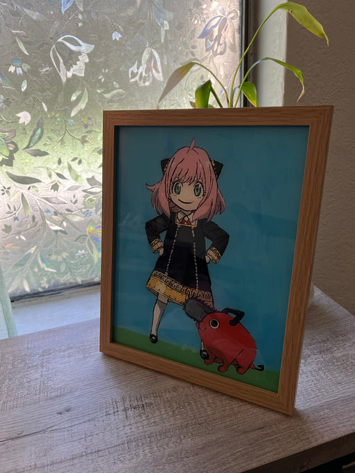 San José Made$42.00| /8inX10in framed glass painting of Spy x Family and Chainsaw Man crossover with Anya Forger and Pochita. Materials: Kat Von D Tattoo Liquid Eyeliner...