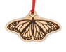 This is a wood monarch butterfly ornament measuring approximately 5" wide and hanging from a hand-tied red ribbon.