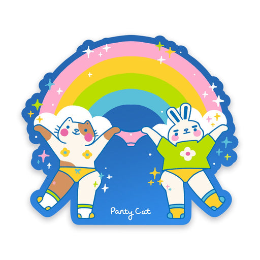 Panty Cat$4.00| /Double booty action with rainbow clouds and an egg sun. What a good day for Cow and Panty Cat. 3" Vinyl sticker Weather-Resistant Dishwasher friendly