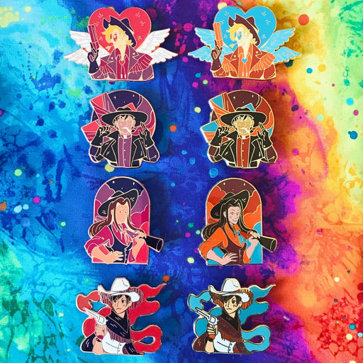 Ultra Infinite Shop$12.00| /The Trigun gang with a cowboy twist! These pins are available in two colorways: purple or blue. The purple has glow accents and copper plating. The...
