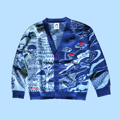 Meridrop$95.00| /This knitted cardigan depicts a peaceful lakeside scene with red embroidery, custom buttons, and tiny knit details (spot the cat!). Inspired by the...