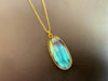 The stone is labradorite . The stone has a eye catching cut and displays blue flash in sunlight. The chain is a 14k gold filled.