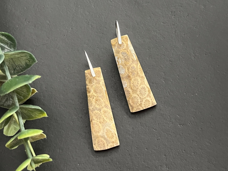 Fossil coral earrings , stone earrings, natural boho earrings, 925 sterling silver ear hooks, faceted cut