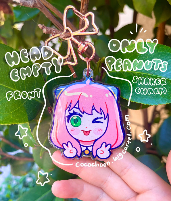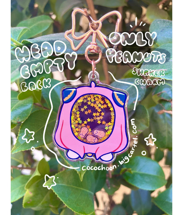 3 inch acrylic shaker charm with 3 peanut shaker charms included. Comes with a gold heart keychain clasp.